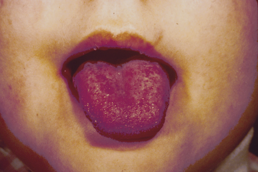L’énanthème est constitué d’un pharynx rouge écarlate, d’une langue saburrale avec desquamation secondaire à partir de la pointe (« langue framboisée », fig. 5).