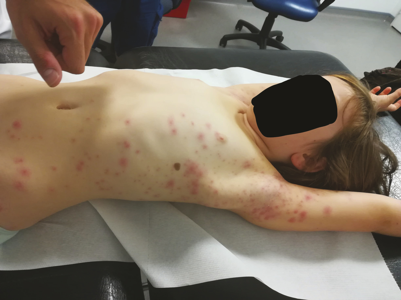Cette fillette de 6 ans, sans antécédent, était amenée par son père pour une éruption cutanée apparue 2 jours auparavant. L’anamnèse révélait qu’elle avait été traitée pour une scarlatine par le médecin traitant 15 jours auparavant. L’examen clinique mettait en évidence un état général conservé, une fièvre à 38,2 °C, une éruption érythémato-vésiculeuse non prurigineuse, indolore, à grande prédominance thoracique gauche. Le père décrivait un début au niveau axillaire gauche, avec une diffusion secondaire. Il n’y avait pas d’adénopathie axillaire, cervicale ou inguinale. Le reste de l’examen était sans particularité. Devant cet aspect clinique particulier, il n’était pas jugé utile de demander une sérologie, et le diagnostic d’exanthème latérothoracique était posé.