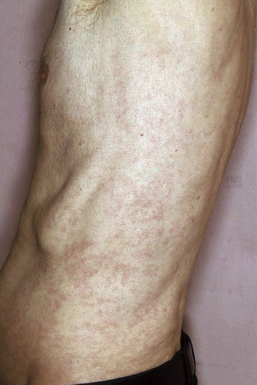 Les exanthèmes maculopapuleux (EMP) sont des événements fréquents caractérisés par un érythème cutané d’apparition brutale et souvent transitoire. Chez l’adulte, les principales causes à rechercher sont la primo-infection VIH (figure ), la syphilis secondaire et les toxidermies. La démarche diagnostique repose d’abord sur l’interrogatoire, à la recherche de prises médicamenteuses, de rapports sexuels à risque, de contages infectieux, du statut vaccinal et de signes associés (fièvre, asthénie, signes respiratoires…). On distingue trois types d’exanthèmes selon leurs caractéristiques cliniques : roséoliforme, morbilliforme et scarlatiniforme. Les signes de gravité clinique à rechercher sont les signes orientant vers une toxidermie : œdème du visage, polyadénopathie, fièvre élevée, signe de Nikolsky, chéilite. Devant un exanthème scarlatiniforme, il faut rechercher des signes de choc toxique staphylococcique. Les examens complémentaires obligatoires chez l’adulte sont les sérologies VIH et de la syphilis qui peuvent être complétés par une NFS (recherche d'hyperéosinophilie ), un bilan rénal et hépatique, des prélèvements bactériologiques (hémocultures si fièvre et prélèvement de gorge si exanthème maculopapuleux scarlatiniforme) et une biopsie cutanée. Chez la femme enceinte, on complétera le bilan en prenant en compte son statut sérologique de début de grossesse, avec une recherche de toxoplasmose, rubéole, cytomégalovirus et parvovirus B19. L’évolution est le plus souvent spontanément favorable, et le traitement sera adapté à la cause identifiée, un traitement symptomatique par dermocorticoïde pourra être débuté.