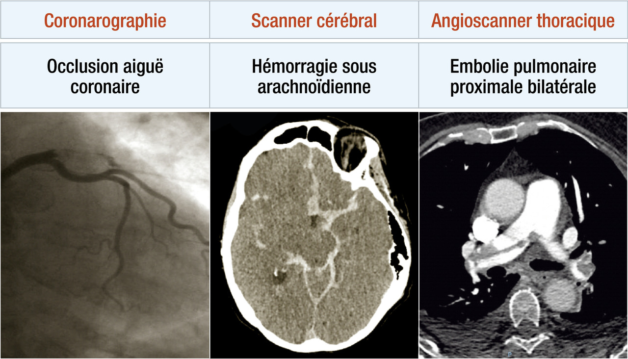 En l’absence de cause cardiaque, différentes causes non cardiaques peuvent également être responsables d’un arrêt cardiaque (embolie pulmonaire, hémorragie méningée, etc.). Les recommandations proposent la réalisation d’un scanner cérébral et d’un angioscanner pulmonaire pour compléter le bilan étiologique (lorsque l’anamnèse est évocatrice d’une cause spécifique ou que le bilan cardiologique est négatif). Ces examens peuvent également permettre d’identifier une complication de la réanimation cardiopulmonaire (fractures costales, hémothorax, etc.).•