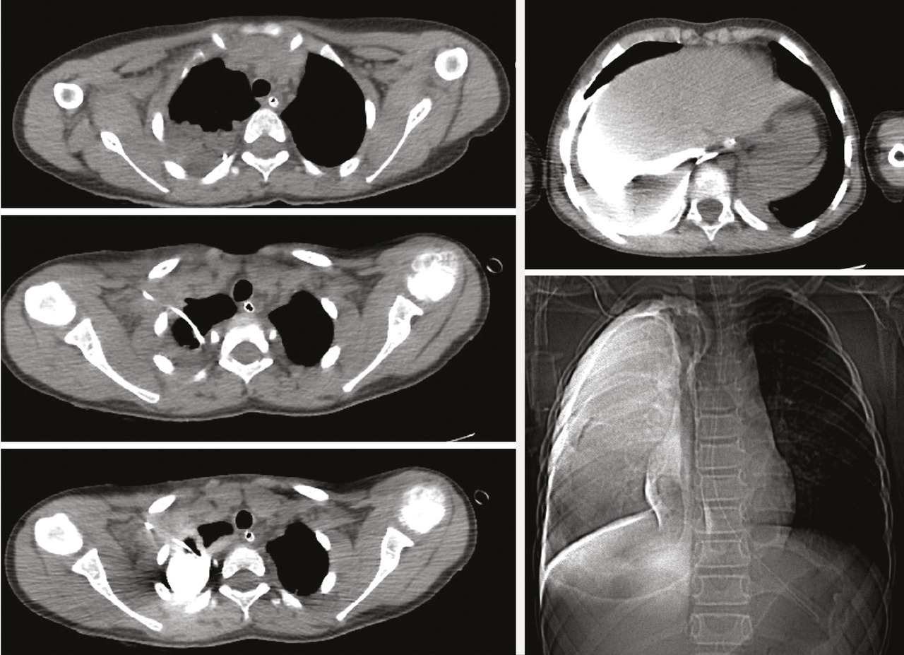 La tomodensitométrie montrait un épanchement pleural droit de moyenne abondance avec collapsus pulmonaire passif en regard, des lacérations hépatiques et une fracture rénale. Après injection de produit de contraste iodé, on notait un remplissage de l’espace pleural droit sans aucune opacification vasculaire secondaire à une position intrapleurale de la voie veineuse centrale (