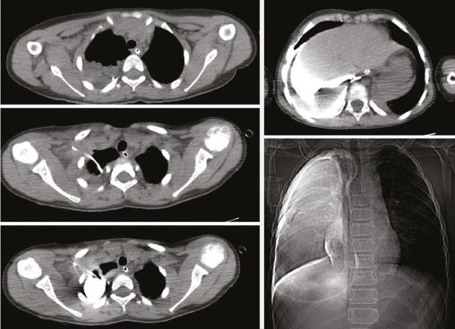 La malposition de voie centrale intrapleurale est une complication peu rapportée dans la littérature et résulte d’une perforation d’une veine à petit calibre à la suite de l’introduction traumatique du cathéter de voie centrale avec migration de ce dernier dans l’espace pleural.2 En effet sa position doit être toujours contrôlée par radiographie, du fait de la corrosivité du produit de contraste, nécessitant un geste de drainage pleural avant l’ablation de ce dernier.