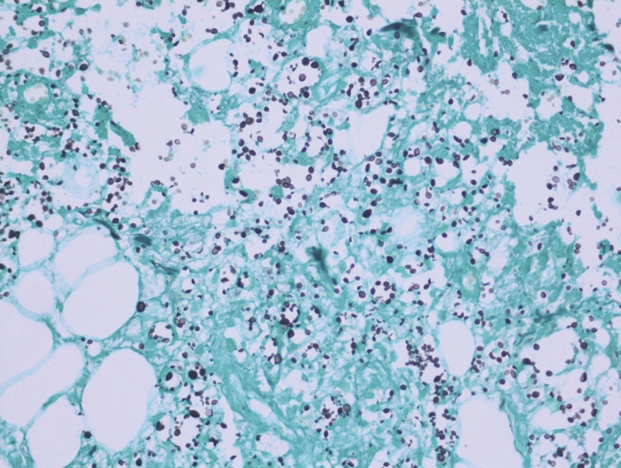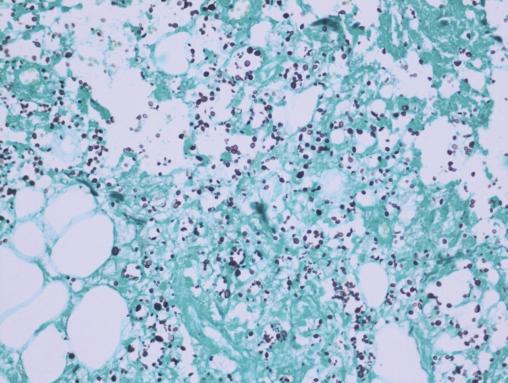 Après quelques jours de traitement immunosuppresseur, une douleur intense et insomniante s’installe, avec érythème et tuméfaction du membre supérieur gauche. Les examens complémentaires retrouvent une protéine C-réactive (CRP) à 300 mg/L, des hémocultures stériles, une échographie Doppler artérioveineuse sans thrombose. Le diagnostic d’une dermohypodermite bactérienne non nécrosante est évoqué dans un premier temps. La patiente est alors traitée par antibiothérapie (amoxicilline et acide clavulanique). L’évolution est défavorable, avec apparition de lésions nécrotico-hémorragiques rapidement extensives (fig. 2 ). Une imagerie par résonance magnétique (IRM) [fig. 3 ] montre une infiltration des parties molles sous-cutanées, des loges musculaires associées à des bulles d’air, en faveur d’une fasciite nécrosante. Une exploration chirurgicale permet de réaliser des biopsies profondes au niveau du fascia et du muscle. Le résultat histologique, après coloration de Grocott, montre une cryptococcose avec multiples foyers de nécrose de liquéfaction (fig. 4 ). Le diagnostic de fasciite nécrosante cryptococcique est finalement retenu. La recherche de l’antigène sérique cryptococique est positive (1 : 2 000, test d’agglutination au latex). La sérologie VIH (virus de l’immunodéficience humaine) est négative. À défaut d’amphotéricine B, du fluconazole à la dose de 400 mg/j est administré. L’évolution a été défavorable, avec décès à la suite d’un choc septique.