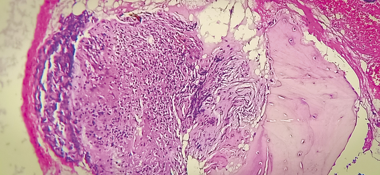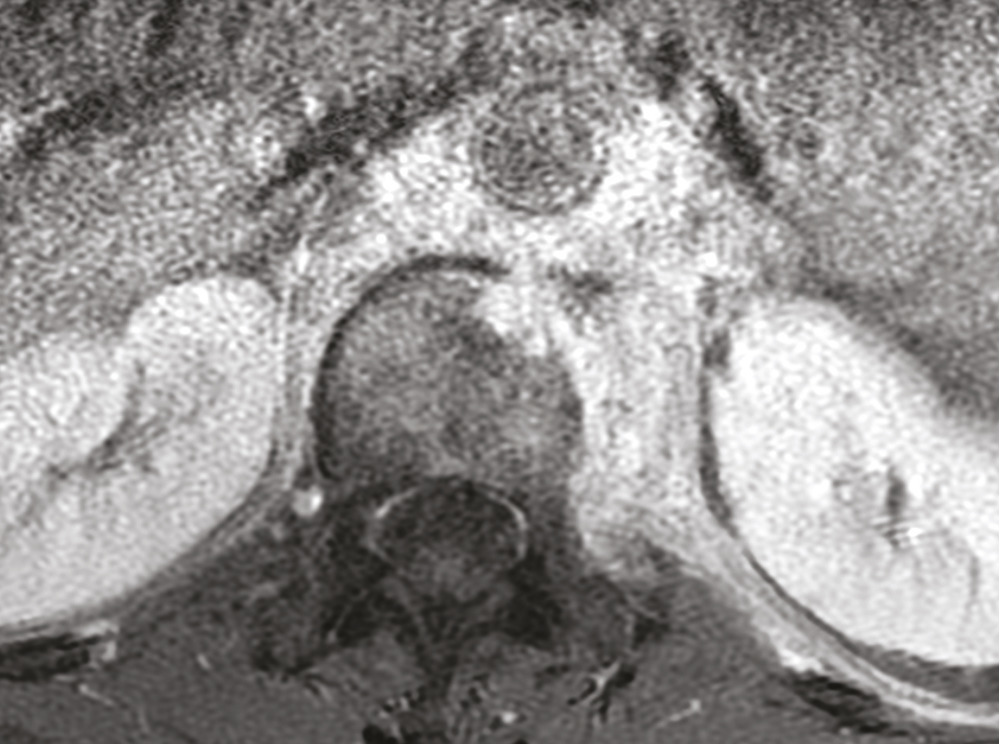 Cet homme de 53 ans consultait pour une douleur de la charnière dorsolombaire à irradiation antérieure, mal calmée par les antalgiques, avec un amaigrissement sans fièvre. L’examen clinique trouvait une raideur rachidienne et le bilan biologique montrait un syndrome inflammatoire. La tomodensitométrie (TDM) abdominale révélait une fibrose rétropéritonéale avec lyse de L1 (fig. 1). L’imagerie par résonance magnétique (IRM) montrait un aspect de fibrose rétropéritonéale secondaire, en hyposignal T1 et T2, se rehaussant après injection du gadolinium avec lyse de L1 (fig. 2). La tomographie par émission de positons au 18-fluorodésoxyglucose (TEP18-FDG) montrait un hypermétabolisme intense de L1 dont la biopsie scannoguidée révélait un granulome épithélio-giganto-cellulaire cadrant avec une tuberculose (fig. 3). Le patient était efficacement traité par les antibacillaires pendant 9 mois.