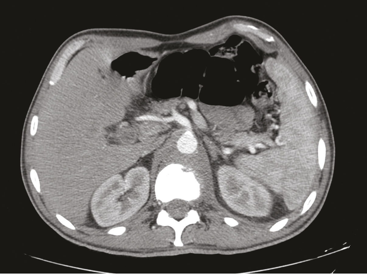 Figure 1. TDM, coupe axiale, fibrose rétropéritonéale refoulant l’aorte en avant avec lyse de L1.