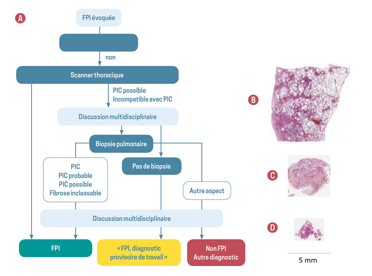 Dans tous les autres cas, lorsque l’aspect du scanner n’est pas caractéristique de PIC (fig. 1D à 1F ), le diagnostic de certitude nécessite une biopsie pulmonaire.