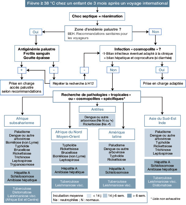 Devant toute fièvre dans les 3 mois suivant le retour de zone d’endémie, quels que soient les symptômes associés : rechercher le paludisme (frottis, goutte épaisse, antigénémie) en urgence +++ ; analyse à répéter 12 heures après si résultats négatifs, surtout si l’enfant a pris une prophylaxie antipaludique.