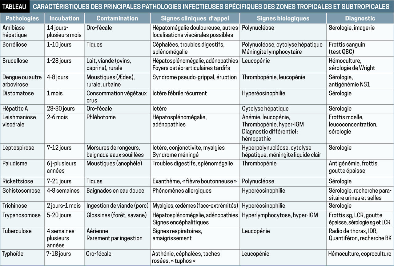 En l’absence de pathologie cosmopolite retrouvée, des examens de 2 e intention tiennent compte du pays visité et du délai d’incubation des pathologies recherchées (tableau).