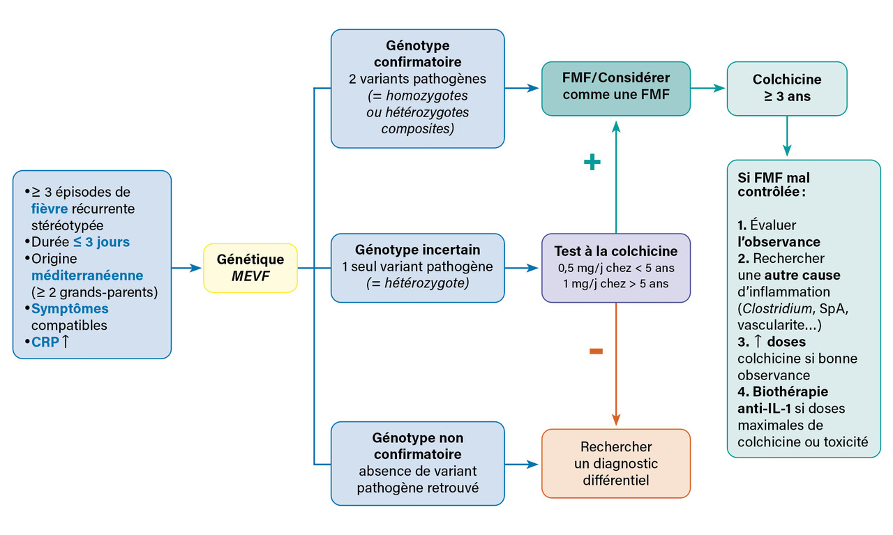 – génotype incertain : présence d’un seul variant pathogène (hétérozygote). Un test thérapeutique à la colchicine peut être proposé. En cas d’efficacité de la colchicine, une hétérozygotie FMF peut être considérée, jusqu’à preuve du contraire. En cas d’inefficacité, les diagnostics différentiels doivent être recherchés.