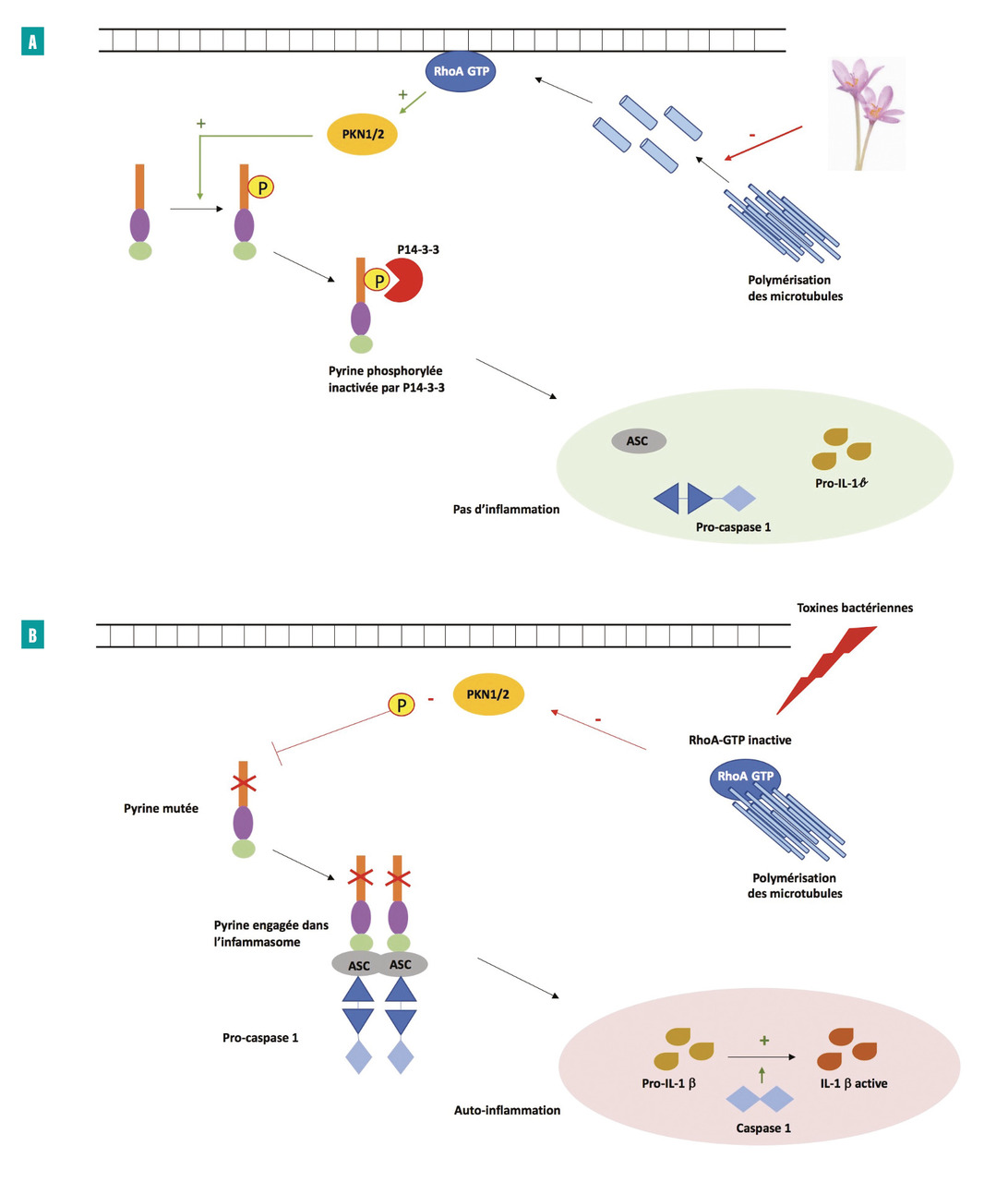 En cas de mutation du gène MEVF, et donc de la pyrine, la phosphorylation ne peut avoir lieu, conduisant ainsi à une activation constitutionnelle de l’inflammasome pyrine, responsable d’une sécrétion excessive d’IL-1 et d’une réponse inflammatoire inappropriée (fig. 3B ). D’un point de vue thérapeutique, la colchicine bloquerait la polymérisation des microtubules, à l’origine d’une libération et d’une activation de RhoA GTPase, entraînant une inhibition de l’inflammasome pyrine (fig. 3A ).22