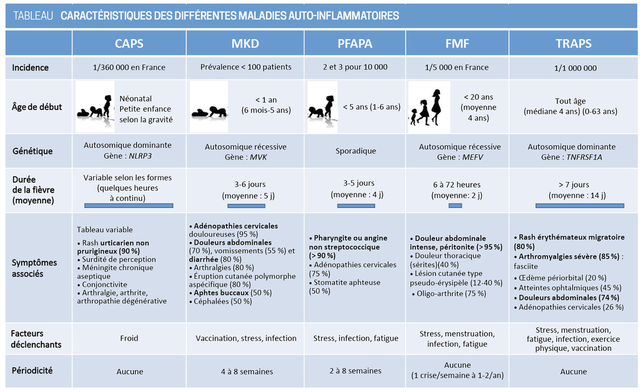 Une fièvre récurrente chez l’enfant doit faire évoquer une maladie auto-inflammatoire (MAI), secondaire à l’activation excessive du système immunitaire inné médiée par des cytokines, notamment l’interleukine 1 (IL-1). La plus fréquente est le PFAPA (Periodic Fever, Aphthous stomatitis, Pharyngitis, cervical Adenitis), devant les affections récurrentes héréditaires telles que la fièvre méditerranéenne familiale (FMF) et les cryopyrinopathies. Ces dernières sont constituées de 3 phénotypes de gravité croissante : urticaire familiale au froid (FCAS), syndrome de Muckle-Wells (MWS) et syndrome chronique inflammatoire cutané et articulaire (CINCA). Plus rares : déficit en mévalonate kinase (MKD) et syndrome TRAPS (TNF receptor associated periodic syndrome ;