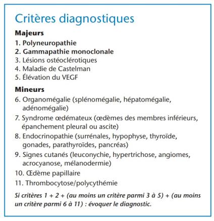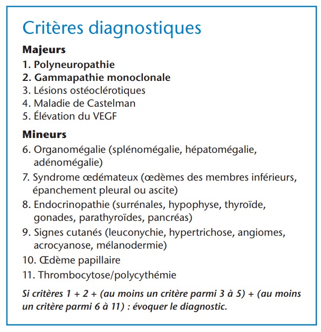 L’électrophorèse des protides montre un pic monoclonal constitué d’une chaîne légère IgA (lambda le plus fréquemment). L’électromyographie met en évidence une polyneuro- pathie démyélinisante dans 30 % des cas, et mixte dans 70 % des cas. Le VEGF est généralement élevé.