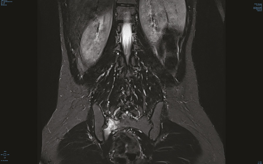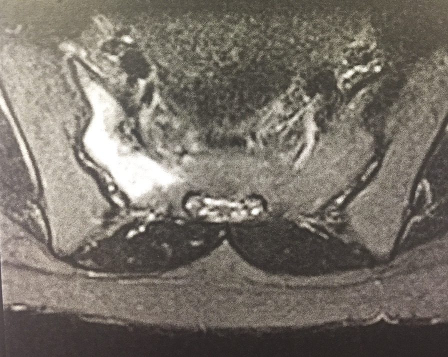 Engagée depuis 2 mois, cette jeune militaire consultait pour des paresthésies des orteils, sans notion de traumatisme aigu. Sédentaire auparavant, elle n’avait aucun antécédent particulier. Son indice de masse corporelle était de 20 kg/m2. L’examen notait une douleur neurogène avec trouble des sensibilités prédominant à l’extrémité du pied droit, sans syndrome radiculaire ni rachidien, d’horaire non mécanique. Le test de Faber était positif. Réalisée en seconde intention, l’IRM du bassin (v. figures) montrait une fracture de contrainte de l’aileron sacré droit. Le bilan biologique était sans particularité. Une cure courte d’anti-inflammatoires non stéroïdiens et la limitation au minimum des activités physiques entraînaient la guérison en 8 semaines.