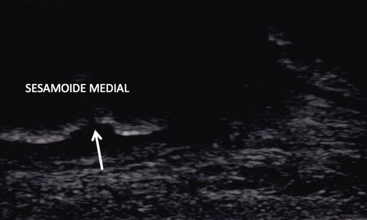 L’échographie décèle une effraction de la corticale du sésamoïde médial, confirmant le diagnostic de fracture de fatigue (fig. 2 ).