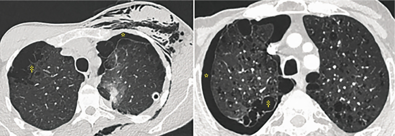 Parmi les patients d’une série française4 souffrant de pneumothorax spontané (n = 83), 85 % étaient fumeurs de tabac (n = 70) dont la moitié consommateurs de cannabis (n = 32), avec en moyenne un usage important de 30 JA (IC 25-75 : 10 à 31). Les scanners thoraciques ont montré un emphysème chez de nombreux sujets (50 % des consommateurs de tabac seul, 71 % des fumeurs tabac-cannabis). Dans ce dernier groupe, les malades étaient plus jeunes (35 ans vs 46 ans, p = 0,009) et consommaient moins de tabac en paquet-années (p = 0,02 ;