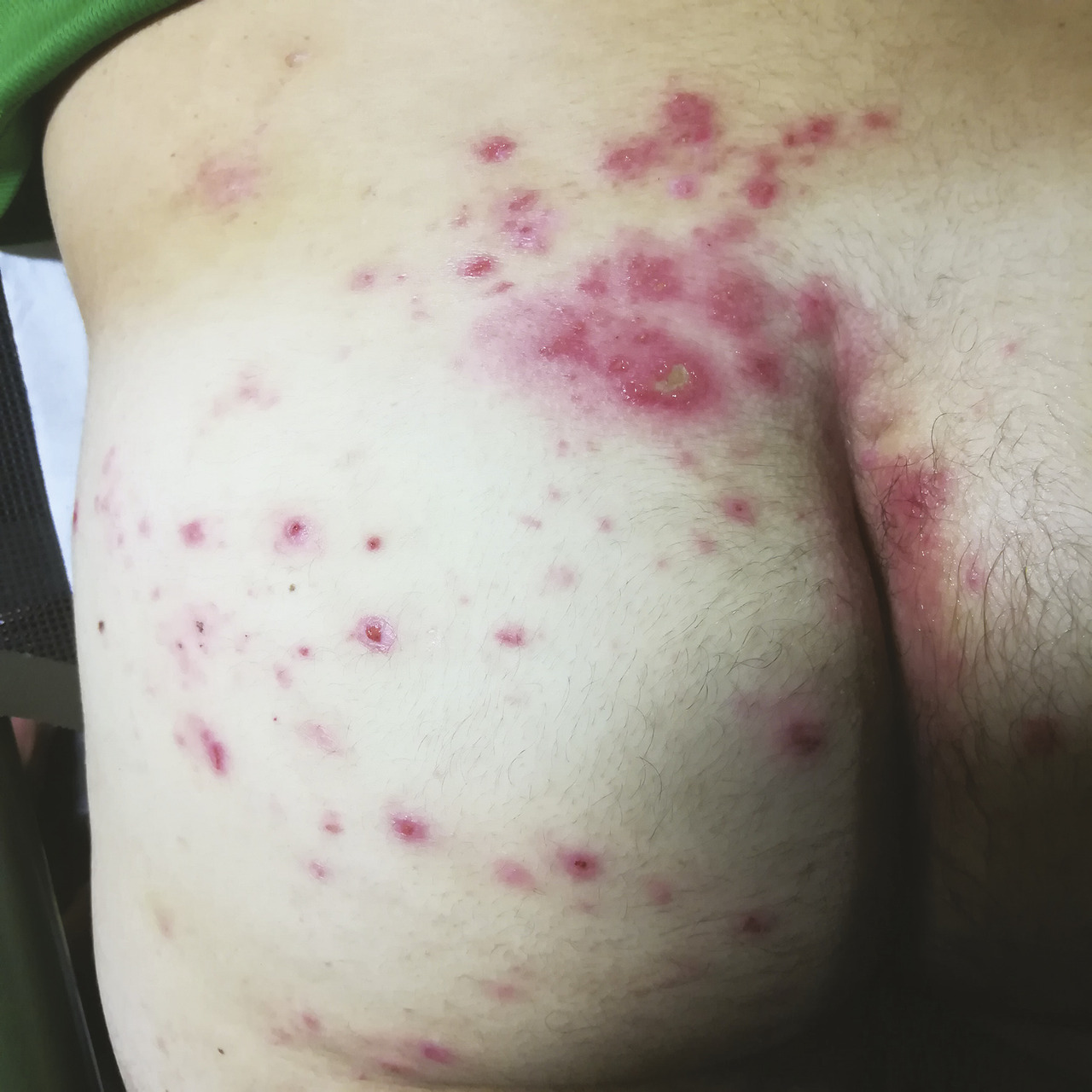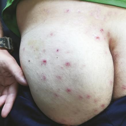 Ce jeune militaire consulte pour des lésions cutanées sur les fesses apparues récemment, après une mission en Afrique dans des conditions d’hygiène précaires et sous un climat chaud et humide. Le seul traitement pris est 1 comprimé de doxycycline 100 mg par jour, en prévention du paludisme. À l’examen, on note des lésions cutanées vésiculo-pustuleuses impétiginisées (photo 1 ) localisées au niveau de la fesse gauche et du sillon interfessier, et la notion antérieure à l’interrogatoire d’un furoncle isolé. Un traitement par pristinamycine 1 g 3 fois/j est prescrit, ainsi qu’un rappel des règles d’hygiène. Les lésions évoluent favorablement à J5 (photo 2 ), permettant l’arrêt du traitement à J7.