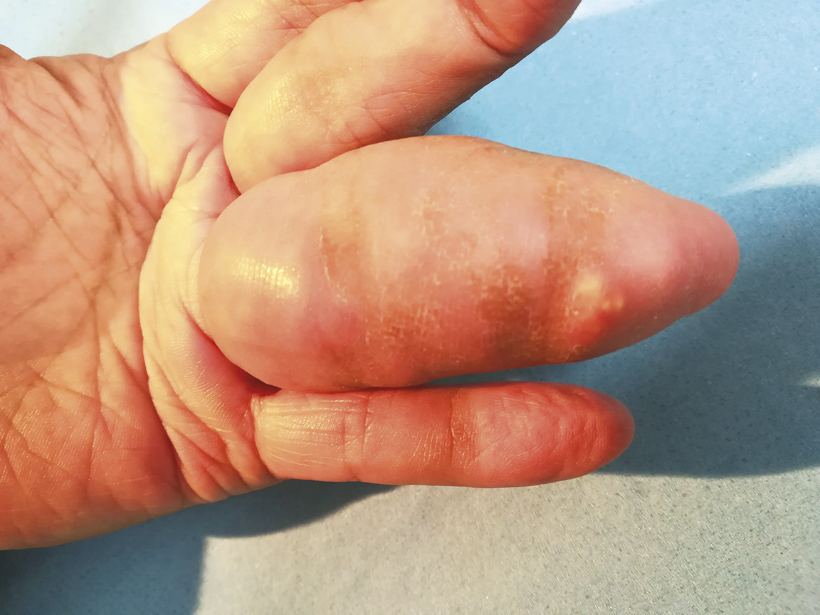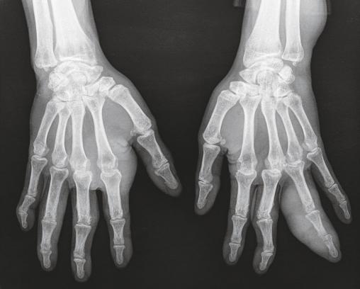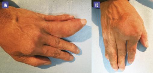 Un homme de 64 ans, avec un indice de masse corporelle à 20, originaire du Laos, ex-pratiquant de boxe thaï, présente des gonflements articulaires des mains évoluant depuis plus de huit mois, sans douleur (fig. 1 ). Cliniquement et à la radio (fig. 2 ), on observe un tophus de 5 centimètres sur 5 au niveau de la 2e articulation métacarpo-phalangienne à droite et une dactylite du 4e rayon à gauche, avec des tophus en voie d’abcédation (fig. 3 ). L’acide urique est dosé à 608 µmol/L, sans syndrome inflammatoire associé.