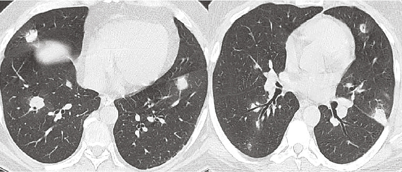 Devant des images pulmonaires nodulaires, a fortiori excavées, il est important de savoir évoquer des causes non tumorales, notamment des infections (tuberculose, abcès, endocardites) et des maladies de système (histiocytose X, polyarthrite rhumatoïde, vascularite à ANCA).1 Cet enjeu diagnostique est fondamental dans les vascularites à ANCA car le pronostic est en partie lié à la rapidité du diagnostic et à la mise en place d’un traitement spécifique, notamment lorsqu’il existe un syndrome pneumo-rénal.2