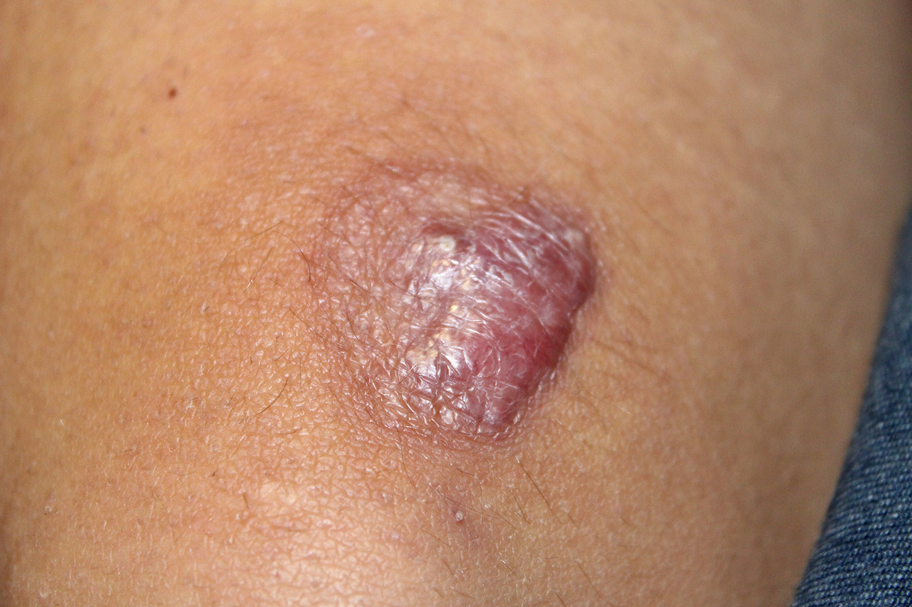 Une formation chéloïde est éliminée (non douloureuse, extension au-delà de la zone affectée, répétition à chaque traumatisme).