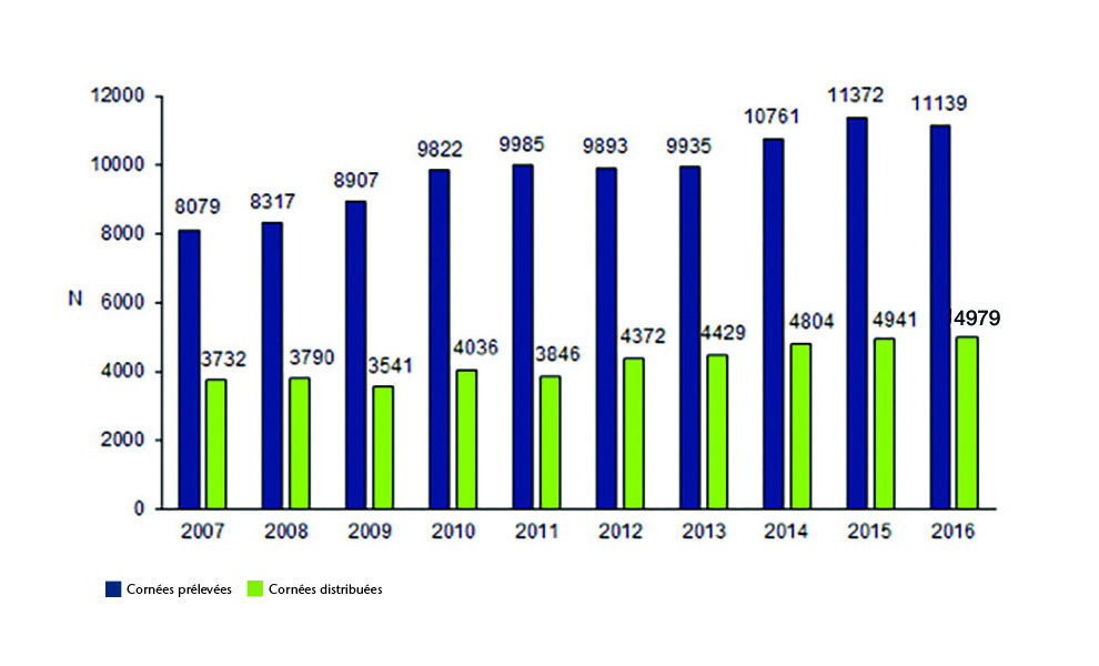 Cette transplantation, a priori complexe sur le plan organisationnel, est en progression. En témoignent les bilans annuels d’activité des banques de ces 10 dernières années, en termes de cornées réceptionnées (de 8 079 en 2007 à 11 136 en 2016 ; figure), délivrées (de 3 732 en 2007 à 4 979 en 2016) et le nombre de patients inscrits en liste d’attente qui croît de façon constante depuis 5 ans et s’établit en 2016 à 5 912.