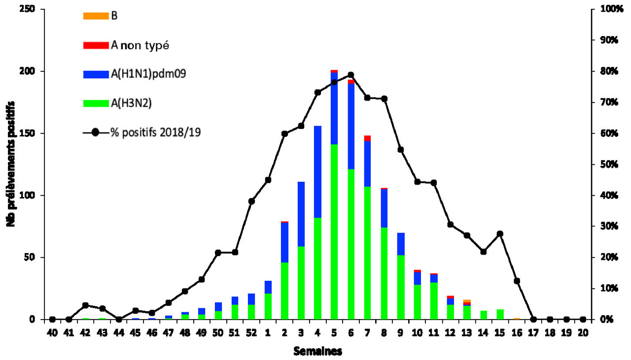 La part relative des virus A(H3N2) a progressivement augmenté pour devenir majoritaire après la semaine 05/2019 (