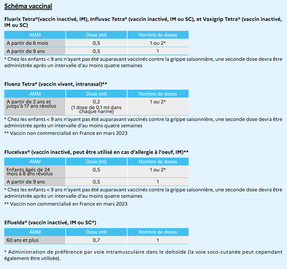 À partir de l’âge de 6 mois, les vaccins Fluarix Tetra, Vaxigrip Tetra, Influvac Tetra peuvent être utilisés indifféremment. Pour les 60 ans et plus, les vaccins possibles sont : Fluarix Tetra, Vaxigrip Tetra, Efluelda et Influvac Tetra.