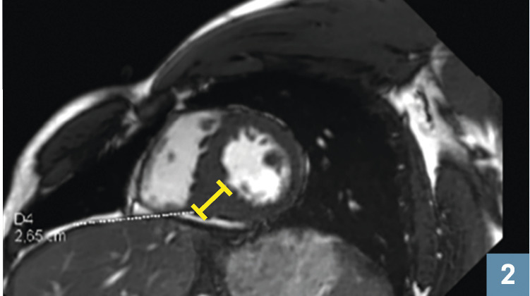 L’IRM de 2019 montre une cardiomyopathie hyper- trophique avec un septum mesuré à 26 mm en inféroseptal.