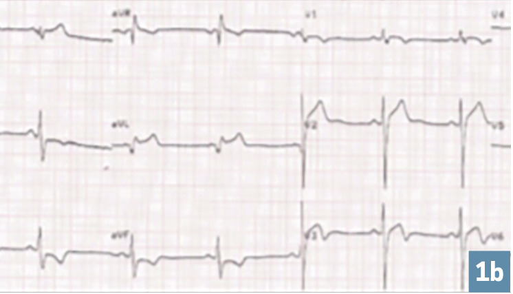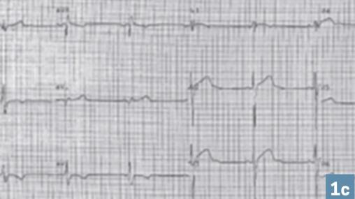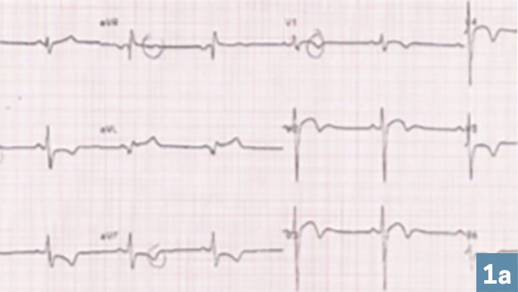 Charles, 34 ans, militaire depuis 2011, est un sportif régulier (10 h/semaine), sans antécédents. Lors de sa visite annuelle d’aptitude de 2019, l’ECG (sinusal et régulier) montre des troubles de repolarisation précoce en V1 et V2 et des ondes T négatives (V3 à V6 et DII, DIII et aVf). La fréquence cardiaque est de 50 batt/min. Le cœur est normo-axé. Il a des épisodes de palpitations depuis plusieurs années.