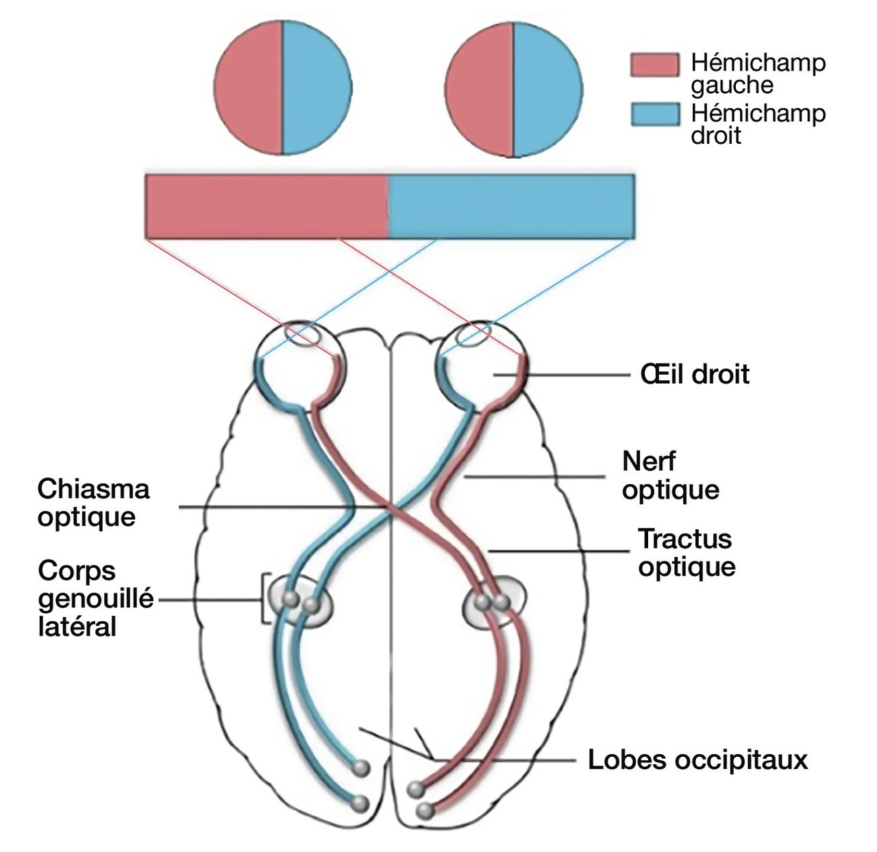 Le système visuel qui va de l’œil jusqu’au cortex occipital est organisé de telle sorte que ce qui est perçu dans le champ visuel droit est traité par l’hémisphère gauche, et vice-versa (figure). Du fait de cette architecture, une lésion unilatérale rétrochiasmatique, et plus particulièrement du cortex visuel primaire, engendre la perte de l’accès conscient à la plupart des informations visuelles, venant du champ visuel contralésionnel.2