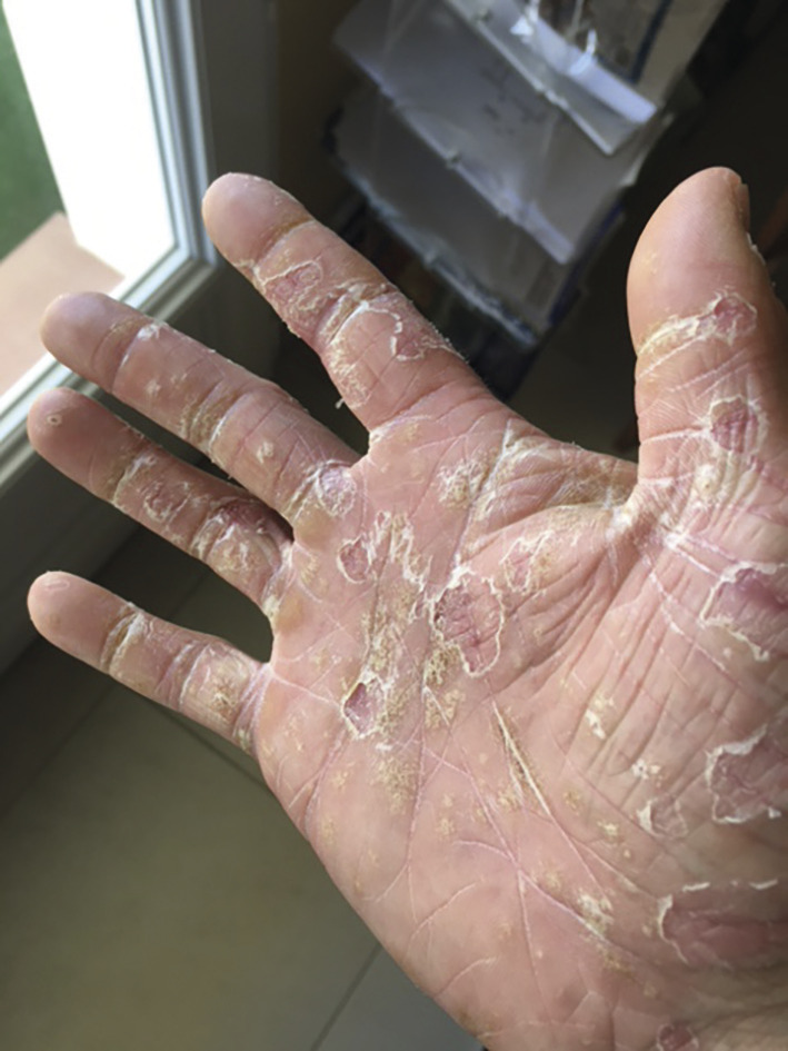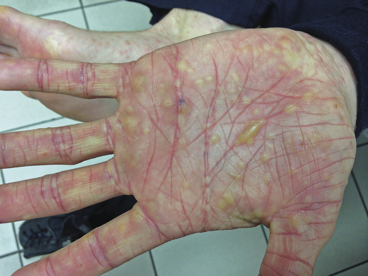 Au bout d’une semaine, les vésicules ont conflué en bulles sur les paumes des mains et les plantes des pieds. Il décrit un prurit palmoplantaire important avec des douleurs intenses qui le handicapent à la marche. Les lésions traitées par bétaméthasone 0,05 % crème au niveau de la face dorsale des mains se sont améliorées.