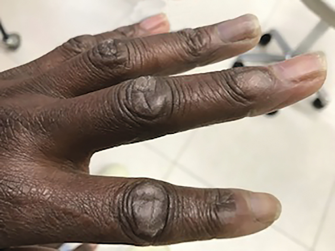 Un homme de 38 ans consulte pour des lésions arrondies, mobiles, épaisses et hypopigmentées apparues progressivement sur la face dorsale de plusieurs articulations interphalangiennes des 2 mains. Il travaille à la plonge d’un restaurant d’entreprise depuis 2013 et porte des gants remontant jusqu’au coude.