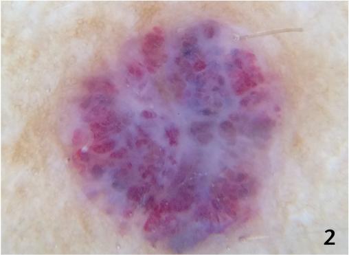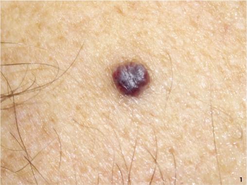 Violette en périphérie, cette lésion a un centre bleu très foncé. Cela n’est pas compatible avec le diagnostic de mélanome malin (dont les couleurs varient entre le marron plus ou moins clair et le noir).