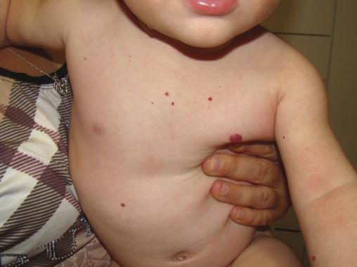 Théo, 4 mois, en parfaite santé, est né avec des angiomes cutanés. Ils sont de plus en plus nombreux depuis sa naissance, dispersés sur tout le corps (figure).
