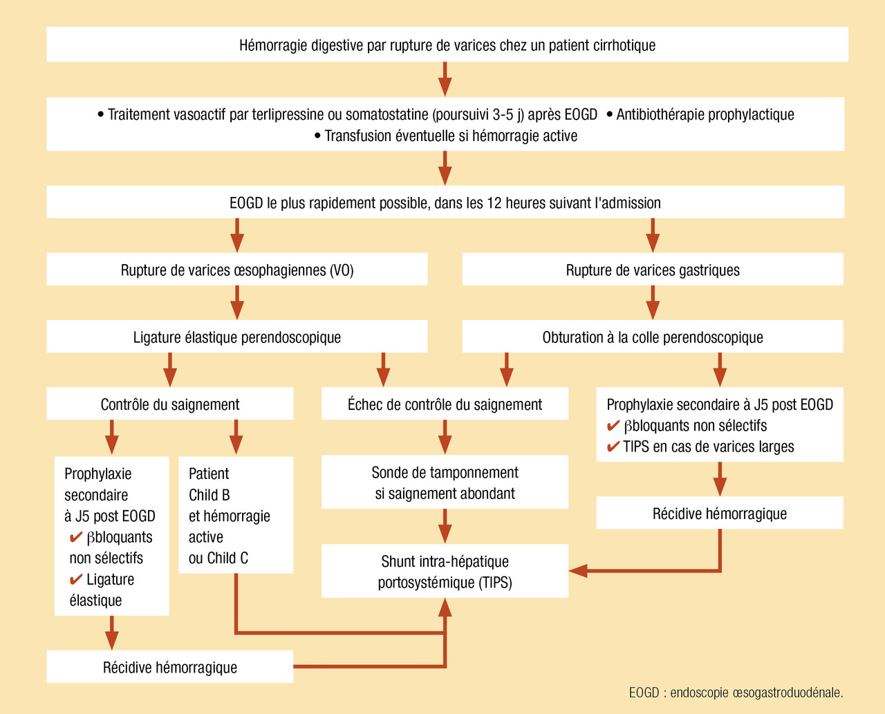 Il constitue une urgence diagnostique et thérapeutique. L’endoscopie digestive haute est réalisée dès que possible en cas d’hémorragie massive et dans les 12 heures suivant l’admission dans tous les cas. Comme dans le cadre de l’hémorragie sans hypertension portale, elle doit être précédée d’une injection d’érythromycine (en l’absence de contre-indication) afin de favoriser la vidange gastrique et réalisée de préférence sous anesthésie générale. Le traitement hémostatique per-endoscopique de la rupture de varices repose sur une ligature élastique en cas de varices œsophagiennes et sur l’obturation à la colle en cas de rupture de varices gastriques. Une fois le traitement per-endoscopique effectué, le traitement vasoactif splanchnique doit être poursuivi pour une durée de trois à cinq jours, puis relayé par un traitement par bêtabloquant non cardiosélectif afin d’éviter qu’un effet rebond de l’hypertension portale ne favorise la récidive hémorragique. En cas de récidive hémorragique précoce, la réalisation d’une dérivation porto- cave intrahépatique par voie transjugulaire (TIPS pour transjugular intrahepatic portosystemic shunt) doit être discutée (v. ci-dessous).