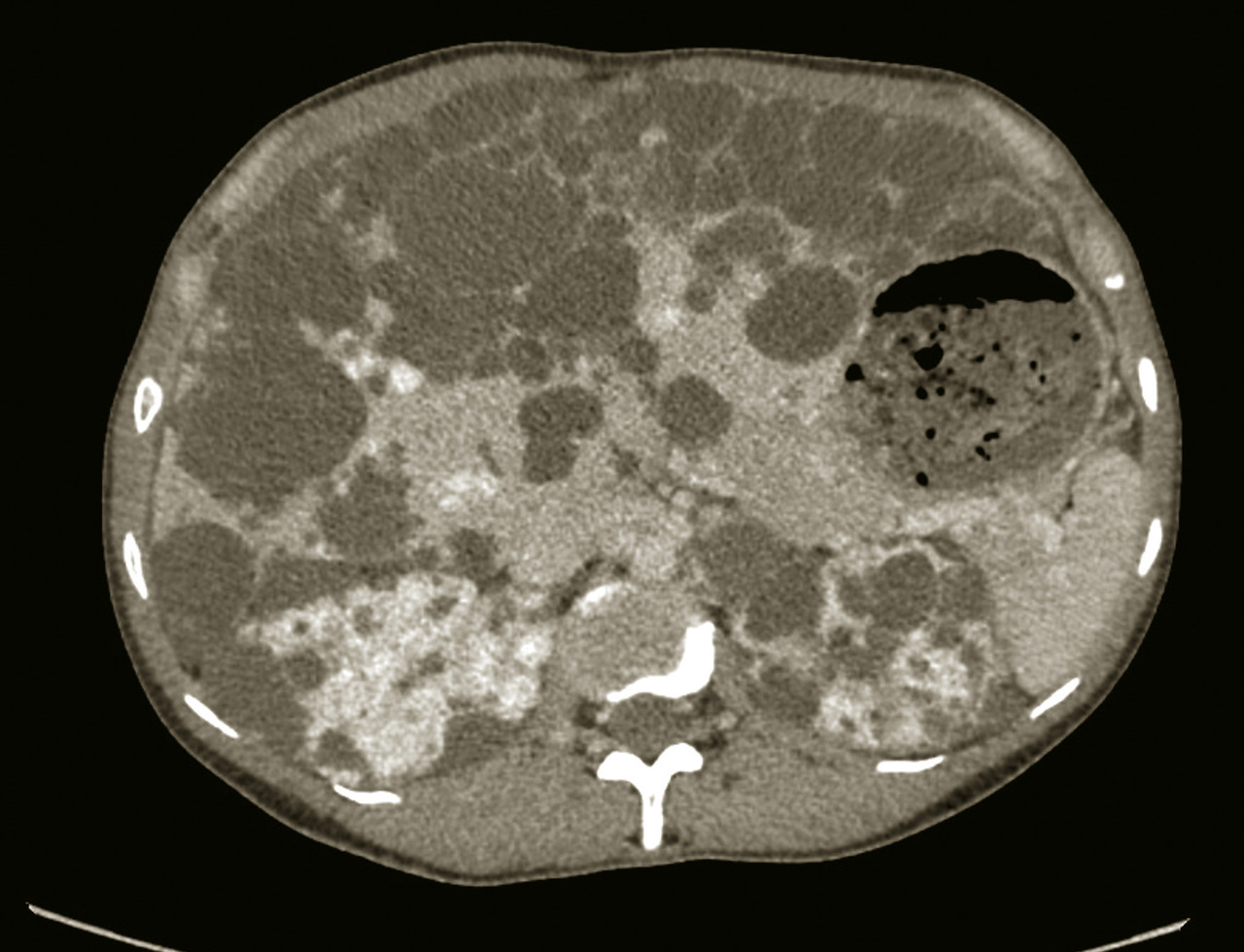 Il peut également s’agir d’une maladie de Crohn compliquée d’un abcès (mode de révélation de la maladie ou complication au cours de son évolution) ou d’une appendicite abcédée ; le patient est alors fébrile et la masse douloureuse. La TDM montrera une collection liquidienne parfois hétérogène, éventuellement associée à d’autres lésions en cas de maladie de Crohn (épaississement des parois, sténose, fistule).