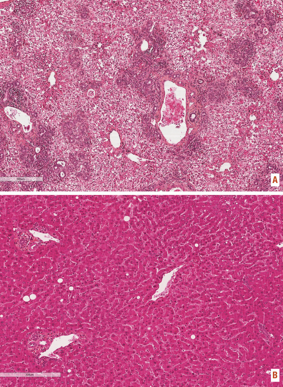 Lorsque les données cliniques, biologiques et d’imagerie ne permettent pas de faire un diagnostic étiologique, la ponction-biopsie hépatique est nécessaire. Elle peut apporter un faisceau d’arguments qui, même s’ils ne sont pas spécifiques, orientent vers une cause donnée. Elle permet également de déterminer le stade évolutif (extension de la nécrose hépatocytaire pour les maladies aiguës, extension de la fibrose pour les maladies chroniques). Si l’hépatomégalie est diffuse, la biopsie est en principe réalisée dans le lobe droit, et un contrôle échographique est recommandé (Les contre-indications à la ponction-biopsie transpariétale sont l’ascite, les troubles de l’hémostase non corrigés (taux de prothrombine inférieur à 50 %, plaquettes inférieures à 60 G/L, temps de céphaline activée [TCA] ratio supérieur à 1,5) et une dilatation des voies biliaires. Les deux premières contre-indications peuvent être contournées en effectuant la biopsie par voie transjugulaire.