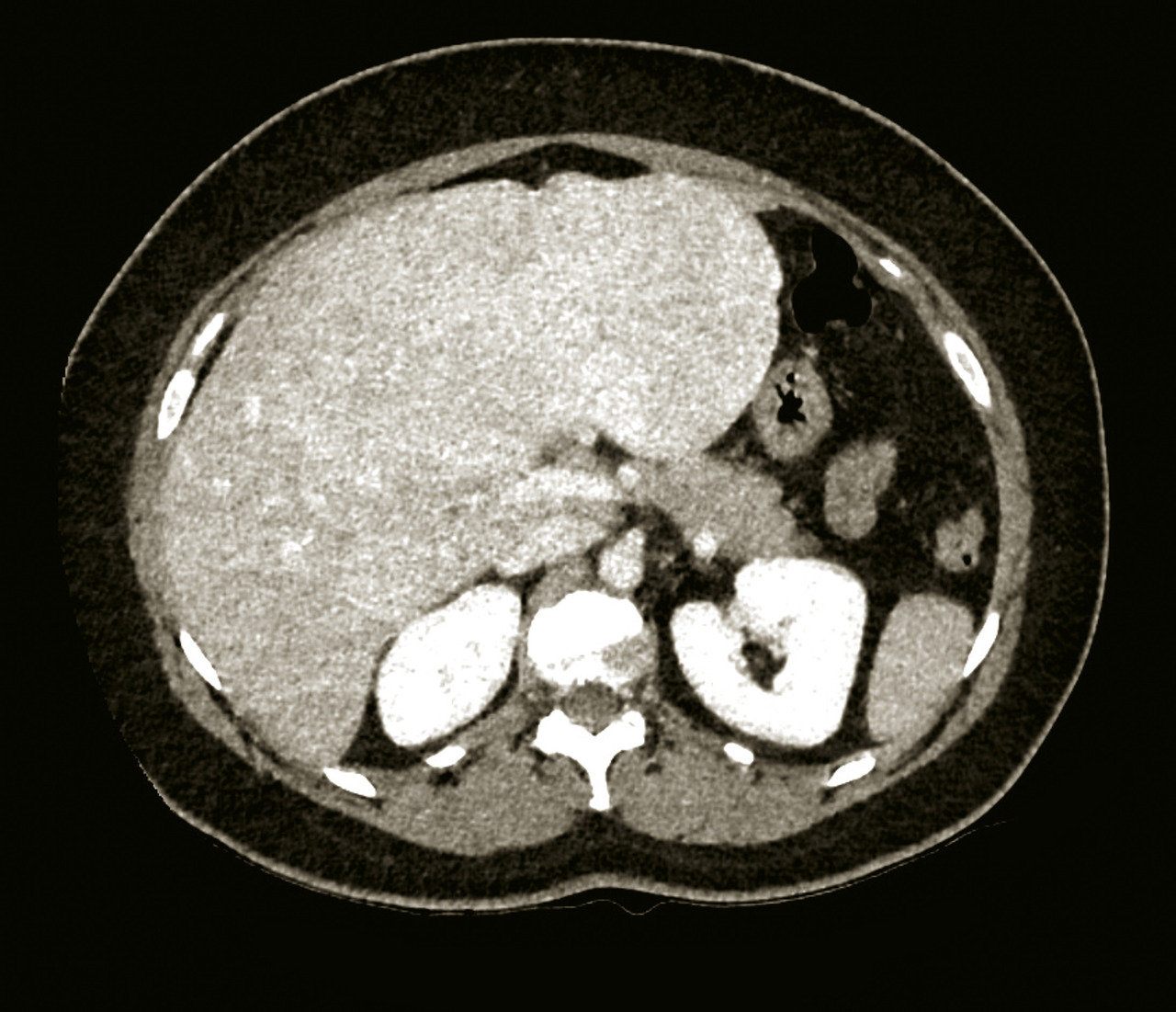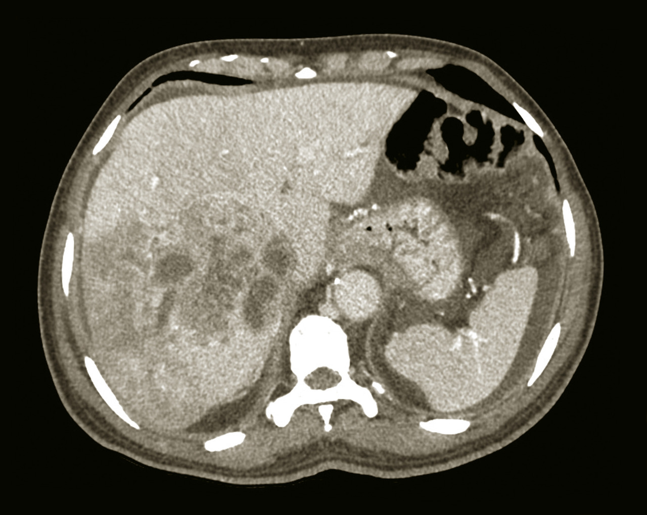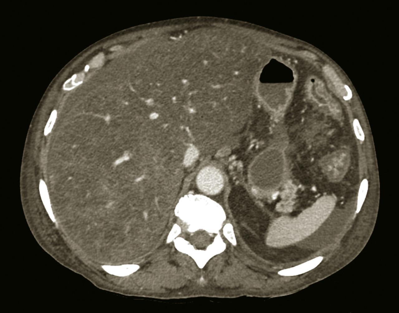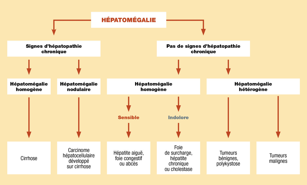 À noter que la cirrhose ne s’accompagne d’une hépatomégalie qu’au stade initial (qui peut durer plusieurs années), elle est alors plus volontiers sectorielle ou hétérogène qu’homogène ; le parenchyme hépatique s’atrophie ensuite avec l’évolution de la maladie.