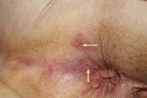 Marie, 72 ans, consulte en urgence pour d’intenses proctalgies dont elle souffre depuis 2 jours. Elle a eu des rapports ano-génitaux non protégés avec un partenaire rencontré via internet. Plusieurs ulcérations sont visibles proches de la région anale (flèches). Un prélèvement est effectué.
