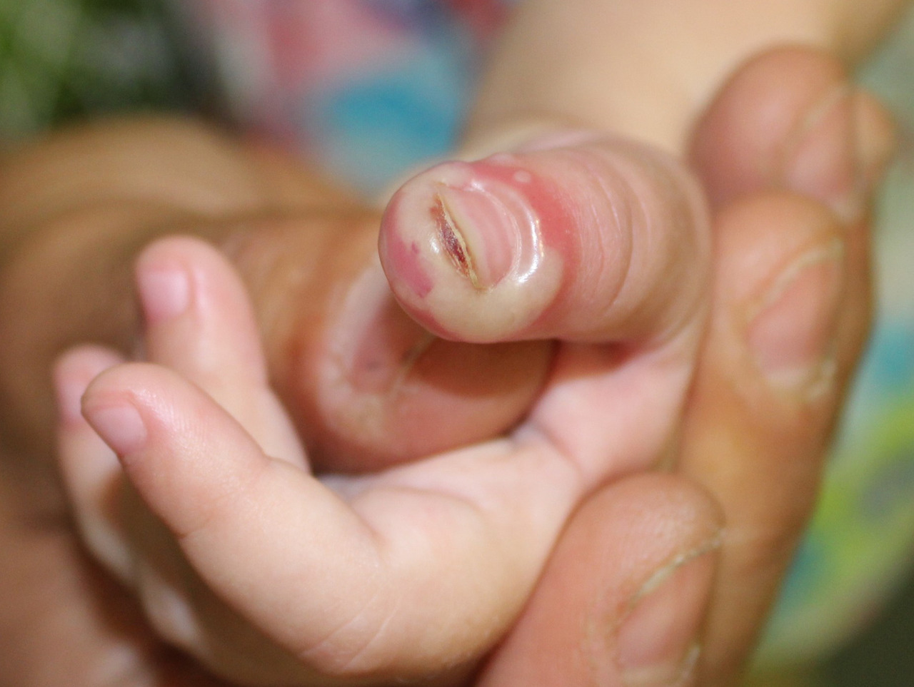 Dylan, 10 mois, est amené en urgence par sa mère pour une bulle surinfectée et douloureuse du pouce droit (