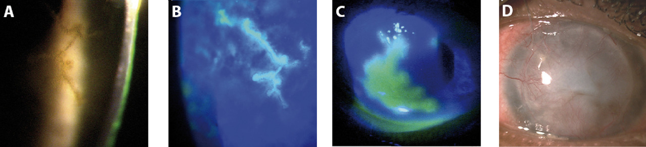 La kératite épithéliale a des aspects variés : ponctuée superficielle, dendritique (la plus typique ; fig. 2), géographique, marginale, en archipel. Les récurrences peuvent se compliquer de cicatrices à l’origine d’une baisse d’acuité visuelle.