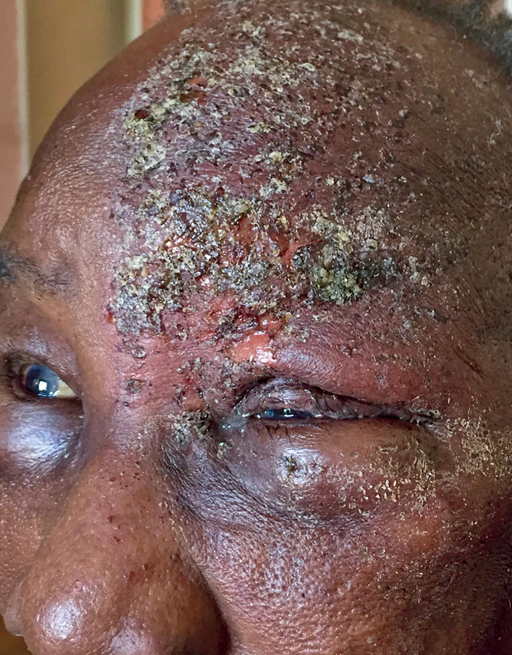 L’érythème et les lésions vésiculo-croûteuses sont isolés ou associés à une atteinte conjonctivale et cornéenne. Celles-ci peuvent s’intégrer à un syndrome de Kaposi-Juliusberg chez le malade atopique. Un traitement antiviral par voie orale, des soins locaux et des antalgiques peuvent être prescrits.