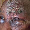 L’exanthème est accompagné de lésions vésiculo-croûteuses arrondies, limitées à un dermatome (généralement le V1 : front, œil, nez), parfois étendu à l’œil (fig. 1). Les complications et la prise en charge sont les mêmes que pour toute autre localisation. Le traitement précoce par valaciclovir (dans un délai inférieur à 72 heures après le début de l’éruption) limite le risque d’algie post-zostérienne.