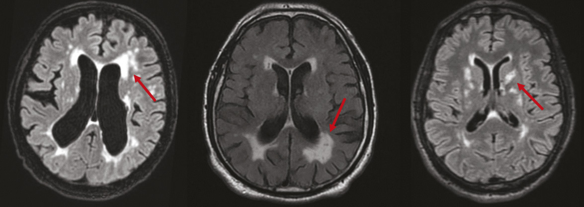 Histologiquement, les anomalies de la substance blanche correspondent à un mélange hétérogène de démyélinisation, de micro-infarctus et de perte axonale. Présentes dans les régions sous-corticales et périventriculaires, elles sont visibles à l’IRM sous la forme d’hypersignaux en séquence T2 et iso- ou hyposignal en séquence T1 (