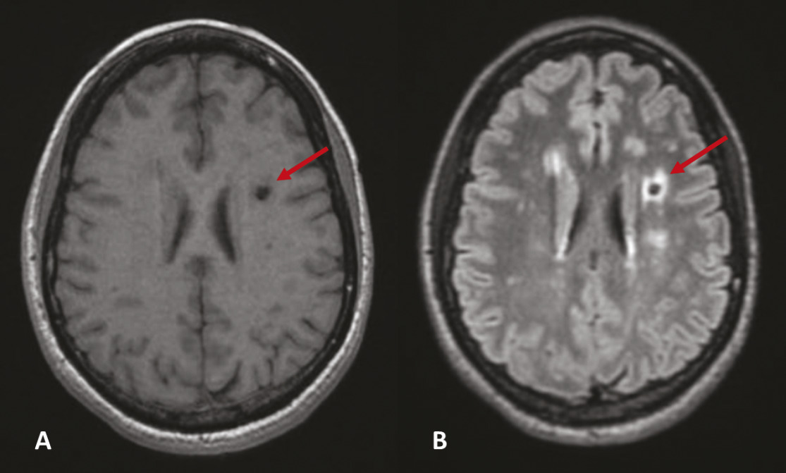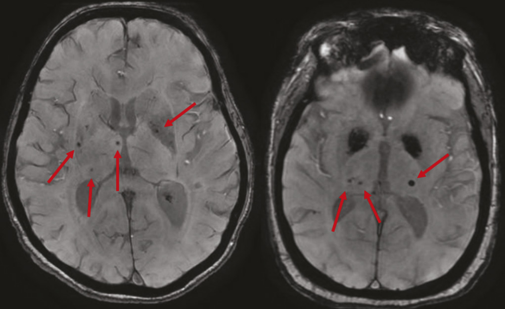 Les microbleeds sont des effractions de sang dans le parenchyme cérébral. À l’IRM, ce sont de petites lésions rondes de 2 à 5 mm, homogènes et très hypo-intenses en séquence de susceptibilité magnétique comme la séquence T2 écho de gradient (T2*) [