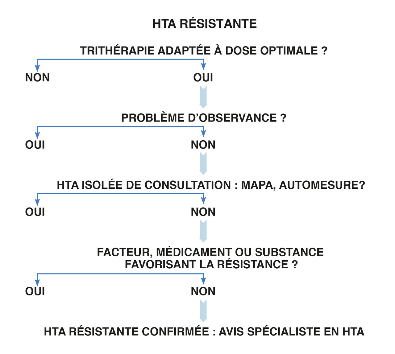 Lorsque la PA n’est toujours pas contrôlée après mesure objective par cette trithérapie à dose optimale, que l’observance a été vérifiée et une HTA secondaire éliminée, il s’agit bien d’une HTA essentielle résistante.