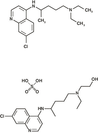 Chloroquine et hydroxychloroquine sont constituées de deux noyaux aromatiques, qui ne sont autres que le noyau quinoléine de la quinine. La chloroquine est un dérivé synthétique obtenu à partir de l’acridine. En France, la chloroquine et l’hydroxychloroquine sont commercialisées sous forme de sulfates (