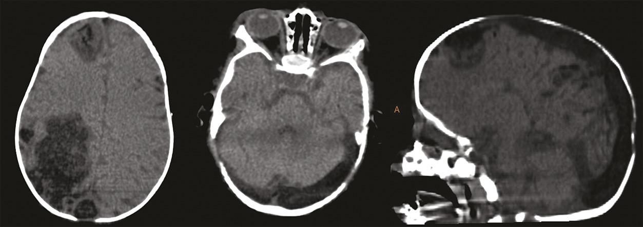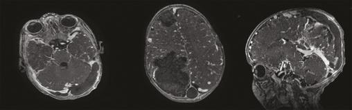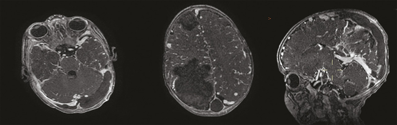 Ce nourrisson de 5 mois était admis aux urgences pour une crise convulsive généralisée. Issu d’un mariage consanguin, il était né par voie basse, sans notion de souffrance néonatale ni antécédents pathologiques notables. L’examen clinique trouvait un syndrome méningé fébrile. Un bilan biologique, une ponction lombaire, une tomodensitométrie et une imagerie par résonance magnétique cérébrales (