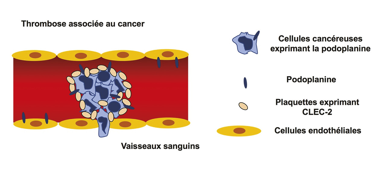 Certaines cellules tumorales peuvent également activer les plaquettes par la podoplanine.3 La podoplanine est une sialoglycoprotéine transmembranaire ligand du récepteur plaquettaire C-type lectin-like receptor 2 (CLEC-2). Elle est présente à la surface de certaines cellules tumorales (mélanome, carcinome épidermoïde, séminome, tumeur cancéreuse cérébrale…) L’augmentation des niveaux de podoplanine est associée à la présence de métastases tumorales ou à la progression maligne ; la podoplanine provenant notamment de tumeurs cérébrales active les plaquettes circulantes, et le risque thrombotique est accru chez ces patients (