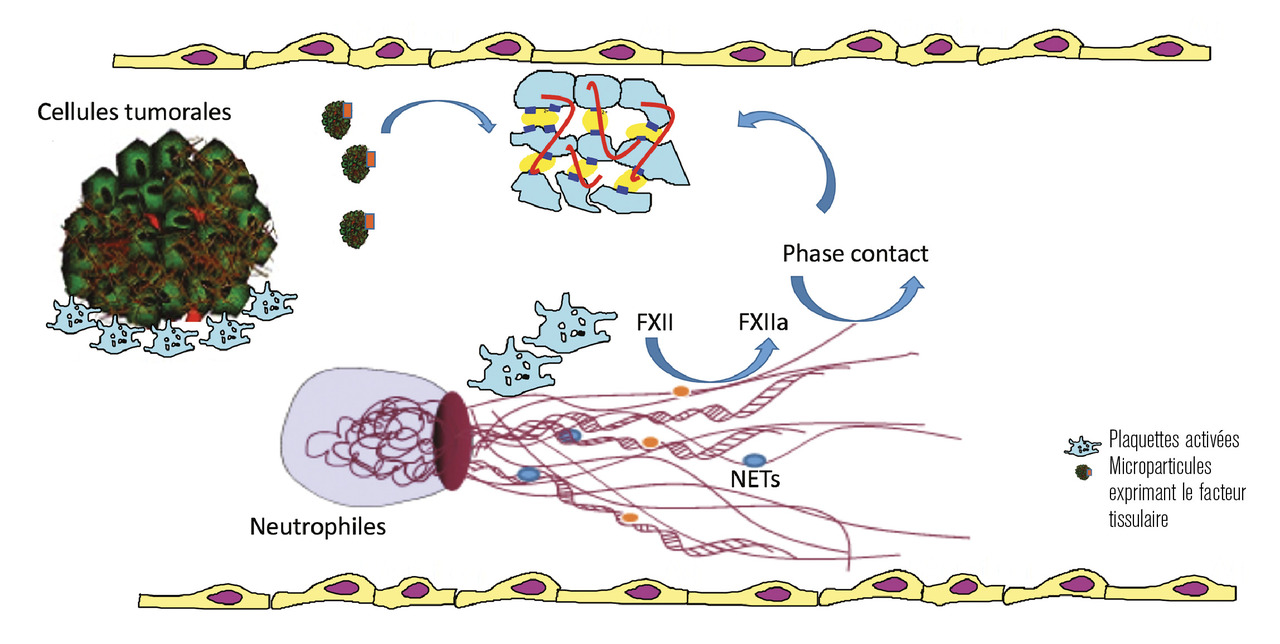 Les cellules cancéreuses prédisposent les neutrophiles à la libération de NETs (neutrophils extracellular traps). Les NETs proviennent de l’externalisation de l’ADN (nucléaire ou mitochondrial) libéré du noyau des neutrophiles, associé à des histones et des protéases granulaires, après activation des PNN. Ces NETs sont responsables d’une adhésion et d’une activation plaquettaire ainsi que d’une activation de la phase-contact de la coagulation,4 à l’origine de l’effet prothrombotique (