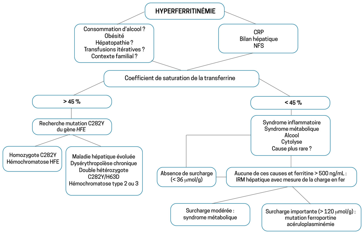 – rapport fer sérique sur transferrine (doser le fer le matin à jeun ; si élevé, contrôler par un 2e prélèvement) ;